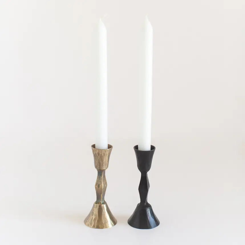 Style these versatile candlestands on their own or paired with the rest of our collection for added depth and texture. Their smaller size makes them an effortless addition to any tablescape while their rich texture makes them impossible to miss. Each is hand-forged by master artisans in India using skills and traditional techniques passed down through generations. A sturdy weighted base has been tip-tested to ensure stability.